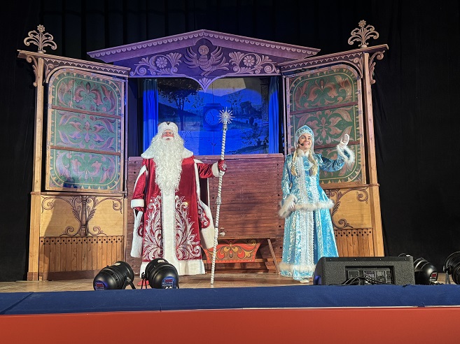 Перед началом спектакля "Аленький Цветочек", представленного театром "Жар-птица", дети активно участвовали в веселых играх и конкурсах вместе с любимыми персонажами зимнего праздника — Дедом Морозом и Снегурочкой, создавая радостную атмосферу вокруг нарядной елки.