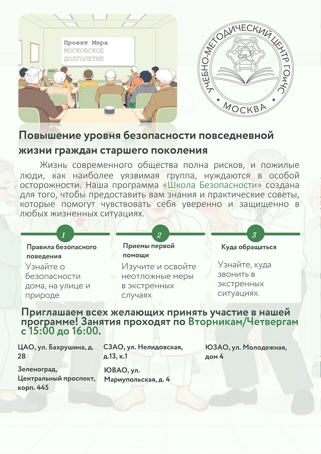 - Наша программа "Школа Безопасности" создана для того, чтобы предоставить необходимые знания и практические навыки, которые помогут пожилым людям чувствовать себя уверенно и защищенно в любых жизненных ситуациях, - рассказал старший преподаватель учебно-методического центра по ГО и ЧС Восточного и Юго-Восточного административных округов г. Москвы Михаил Чирков. –  Занятия носят просветительский и прикладной характер, позволяя слушателям применять полученные знания и навыки непосредственно в быту. Целевая группа формируется с учетом возрастных особенностей, обеспечивая очень эффективное обучение.