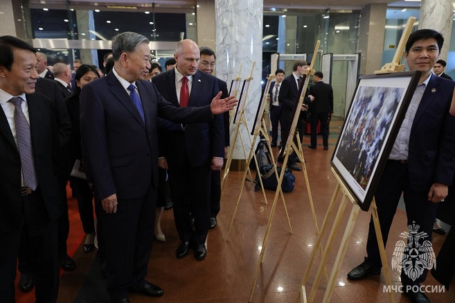 Глава российского ведомства осмотрел экспозицию вместе с Генеральным секретарем Коммунистической партии Вьетнама То Ламом. Руководители побеседовали о международном партнерстве при выполнении гуманитарных операций.
