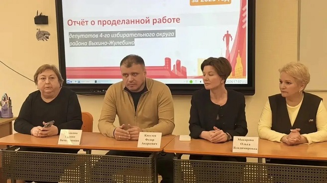 27 февраля 2026 года состоялась встреча муниципальных депутатов с жителями района Выхино-Жулебино. На встрече присутствовали глава муниципального округа Калькова Н.В., депутаты Назарова Н.Г., Троицкий А.В., Смирнова О.А., Гордеева Е.М.и Сокольникас В.Ю. Депутаты рассказали о своей работе за 2025 год, в каких мероприятиях участвовали, какие вопросы удалось решить в рамках полномочий, представили показатели работы за 2025 год и планы работы на следующий год. После отчетов депутатов состоялся открытый диалог; жители задавали вопросы, а депутаты отвечали.