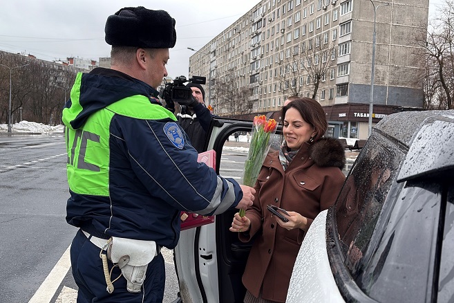 В преддверии Международного женского дня сотрудники Госавтоинспекции Юго-Восточного административного округа Москвы совместно с членом Общественного совета при УВД по ЮВАО Геннадием Чумаченко присоединились к Всероссийской акции «Цветы для автоледи», цель которой не только напомнить о важности соблюдения правил дорожного движения, но и подарить женщинам-водителям положительные эмоции и праздничное настроение.